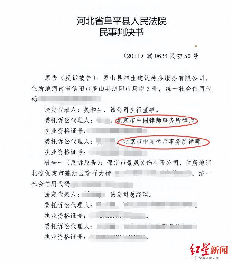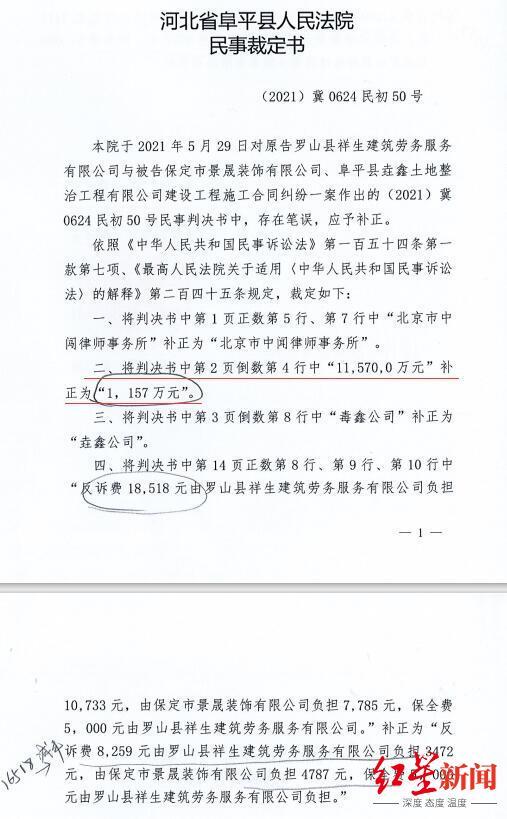 10月15日,红星新闻记者收到了阜平县人民法院关于此事的回函。法院在回函中表示,在审理罗山县祥生建筑劳动服务有限公司与保定市景晟装饰有限公司、阜平县垚鑫土地整治工程有限公司建设工程施工合同纠纷一案中,由于工作人员责任心不强、审核把关不严,导致案件判决书及补正裁定书中出现多处错误。针对此情况,法院当即启动责任倒查和追责机制,对办案法官、法官助理及主管院领导分别作出停职、提醒谈话、向院党组做出深刻检查、在全院通报批评的处理。