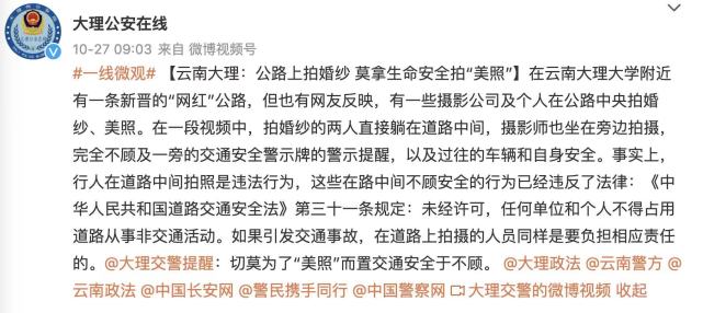 10月27日,云南省大理州公安局官微发布“云南大理:公路上拍婚纱 莫拿生命安全拍‘美照’”称,事实上,行人在道路中间拍照是违法行为,这些在路中间不顾安全的行为已经违反了法律:《中华人民共和国道路交通安全法》第三十一条规定:未经许可,任何单位和个人不得占用道路从事非交通活动。如果引发交通事故,在道路上拍摄的人员同样是要负担相应责任的。同时,大理交警也提醒大家,切莫为了“美照”而置交通安全于不顾。