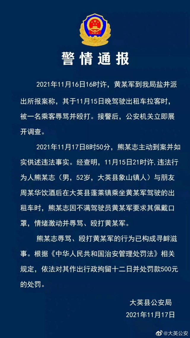 据四川省遂宁市大英县公安局11月17 日发布的通报:2021年11月16日16时许,黄某军到大英县公安局盐井派出所报案称,其于11月15日晚驾驶出租车拉客时,被一名乘客辱骂并殴打。接警后,公安机关立即展开调查。