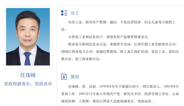 政知君注意到,任珠峰担任过中国五矿集团有限公司副总经理、党组成员兼五矿资本股份有限公司、五矿资本控股有限公司董事长,2021年3月成为江西省副省长。