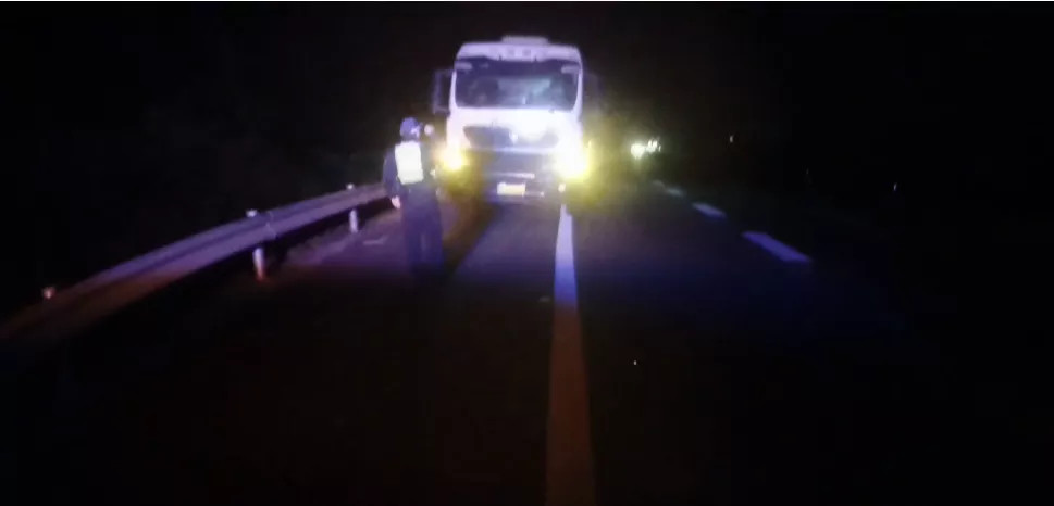 11月24日凌晨0时30分许,广西公安厅交警总队高速公路管理支队七大队民警巡逻至兰海高速大寺收费站时,发现一辆鲁J半挂车违停在应急车道上,民警见状立即上前检查。