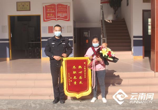 12月8日,云南怒江福贡县上帕镇腊竹底村民宋女士将一面写有“热心为民、尽职尽责”的锦旗送到了上帕边境派出所民警手中,向前几天热心帮助她找回三万元现金的民警们,表达了感激之情。