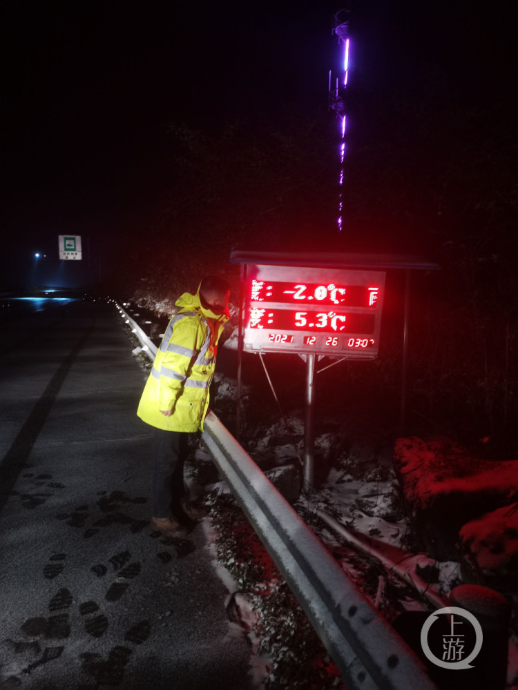 12月26日,上游新闻记者从重庆高速集团东南营运分公司获悉,受冷空气影响,渝湘高速黔江、酉阳、秀山段迎来今冬首场降雪,最低温度-2.5℃。受降雪天气影响,黔江西、酉阳、秀山等多个收费站入口实行交通管制。
