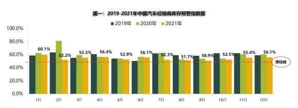 中国汽车流通协会数据显示,2021年下半年,连续多月经销商库存预警指数降至近三年以来最低水平。其中,2021年12月汽车经销商库存预警指数降至56.1%,同比下降了4.6个百分点。