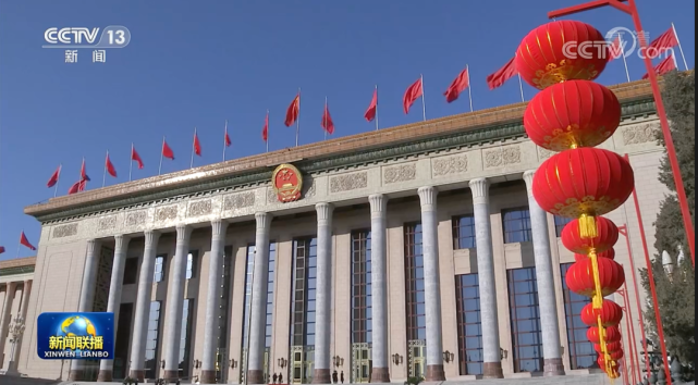 正月初五的人民大会堂“年味”浓郁,处处可见笑容可掬的“冰墩墩”、“雪容融”,春联福字、剪纸年画、中国结、大红灯笼等。