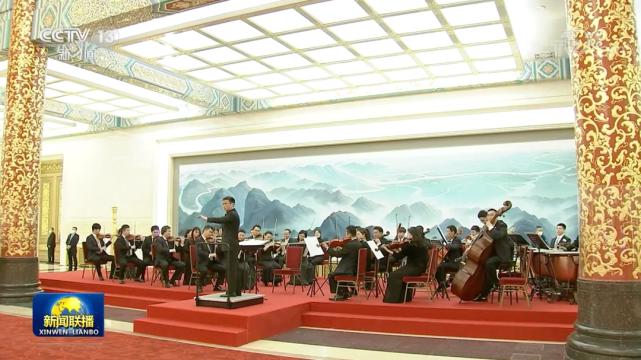 当贵宾们步入金色大厅的时候,听到的是《和平——命运共同体》迎宾曲;席间,来自五大洲有代表性的乐曲和最有中国特色的民间乐曲交替奏响;宴会结束的时候,贵宾们听到的是交响乐版《一起向未来》,这也是北京冬奥会的这首主题曲被改编成交响乐版后的第一次演出。