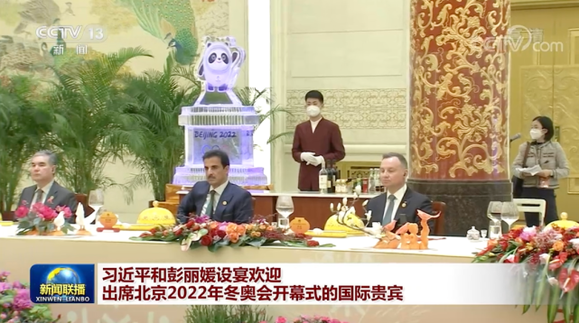 2月5日中午,国家主席习近平和夫人彭丽媛在北京人民大会堂金色大厅举行宴会,欢迎出席北京2022年冬奥会开幕式的国际贵宾。