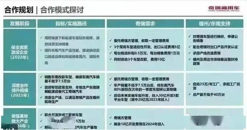 近日,一份关于奇瑞商用车与东南汽车合作规划的资料在网络上传出。