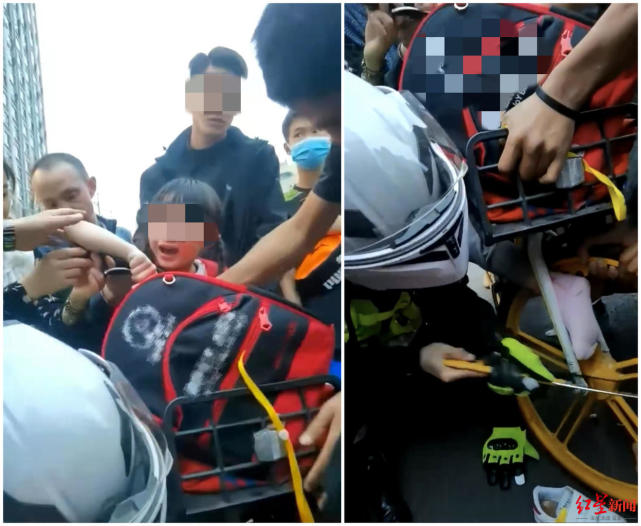 “共享单车带娃神器”闯祸 女孩脚被卡单车前轮 消防员紧急破拆
