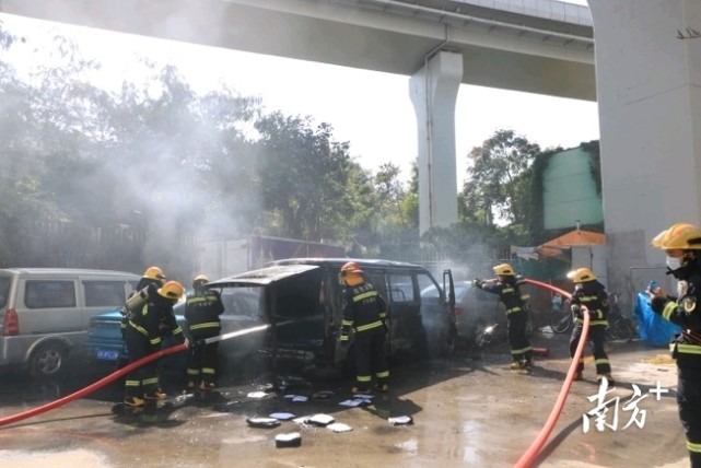 12名消防员到达现场后发现,一辆面包车已被大火吞噬,火势猛烈,旁边停放的小轿车也受到波及,庆幸车内无人员被困。