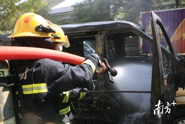 指挥员令队员出一支干线两支水枪对火势进行压制。经过15分钟的紧张施救,火灾被扑灭。为防止车辆复燃,消防员利用铁锹和开花水枪对车辆进行反复清理和冷却降温,在确认车辆无复燃的可能性后,现场移交公安机关。
