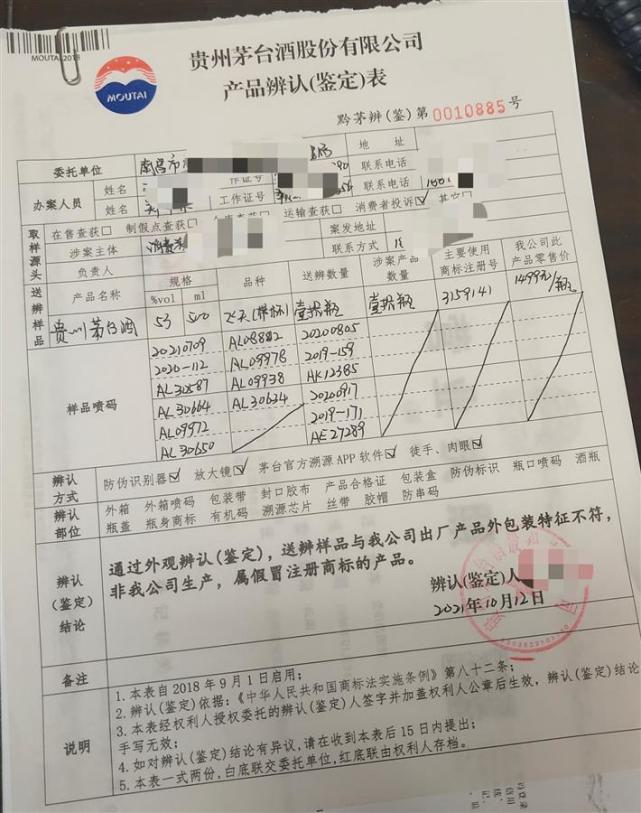 无奈之下,陶女士只好预约茅台打假办进行鉴定。2021年10月12日,在当地市场监管局的委托下,陶女士拿到了“贵州茅台酒股份有限公司产品辨认(鉴定)表”。结果显示,她购买的10瓶贵州茅台酒全部为假冒注册商标的产品。