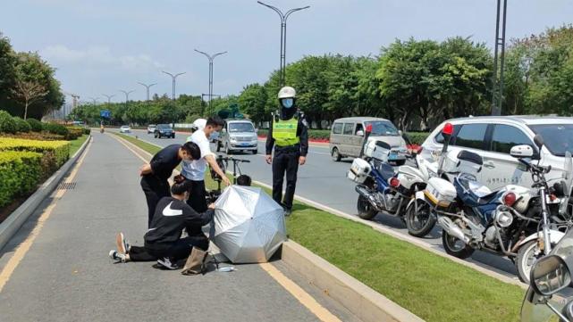 3月15日中午12时,金唐交警大队辅警小李、小付巡逻至港湾大道南方软件园路段时,突然发现路边有一名女子倒在路边,路人上前求助。他们赶紧停车上前查看,只见女子全身抽搐,口吐白沫,神情异常痛苦。此时烈日正猛,小李立即借来遮阳伞为女子撑起一片阴凉,随后将女子缓缓扶起靠在路边,小付则联系120救护车。在交警和路人的照顾下,女子恢复意识,在被救护车接走前为交警竖起了大拇指。