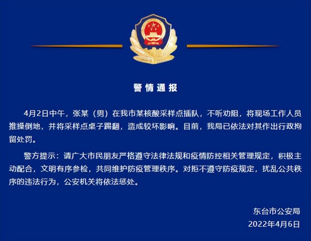 4月2日中午,张某(男)在我市某核酸采样点插队,不听劝阻,将现场工作人员推搡倒地,并将采样点桌子踢翻,造成较坏影响。目前,我局已依法对其作出行政拘留处罚。