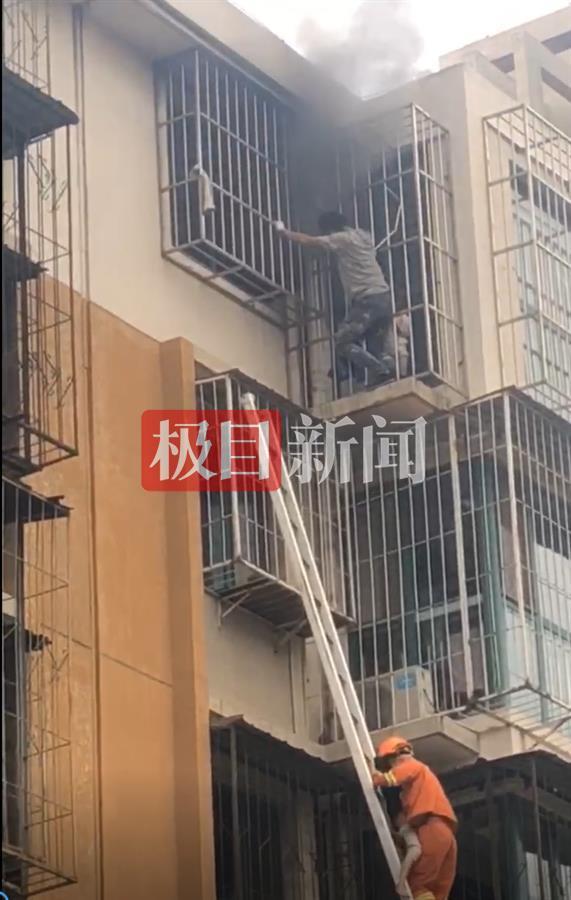 房屋失火两个孩子被反锁在家,男子搭“天梯”爬上6楼救援