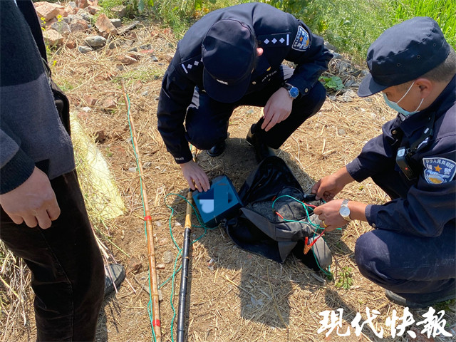 这不是孤例。5月3日上午9时许,沿河派出所民警在沿河镇东兴居委会巡逻时,发现有人站在居委会的樊阳庄小河边。出于对其安全的关心,民警上前询问情况。“看到我们走近时,男子慌张地隐藏脚底的东西。”即便如此,细心的民警发现了一根绑着电线的捕鱼杆。