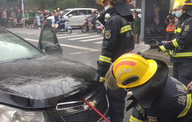 听了严先生的提醒后,车主当即将车辆停在了某小区车辆出入口处。这时周围的路人、小区的保安都围了过来。“要想赶快办法灭火。”严先生和小区保安找来了2个水桶,保安负责接水,把装满水的桶递给严先生,再由严先生将水浇在车辆引擎盖上灭火。