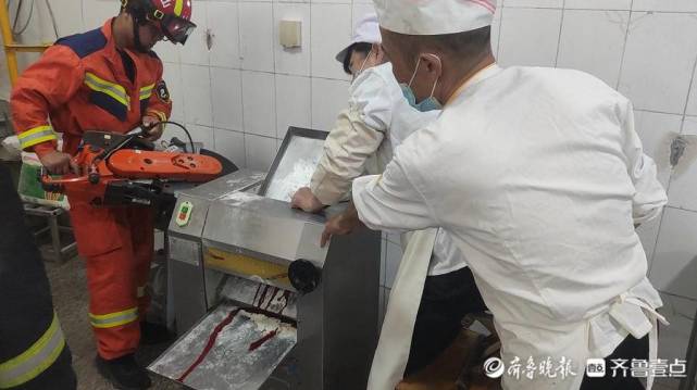 食堂女员工手指被揉面机卡住,消防人员撬开机器救援