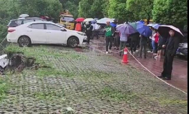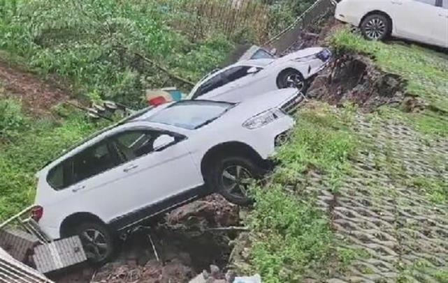 居民现场拍摄的视频显示,当时正在下雨,停车场边缘的护坡发生垮塌,两辆白色轿车和一辆面包车滑落到护坡下。