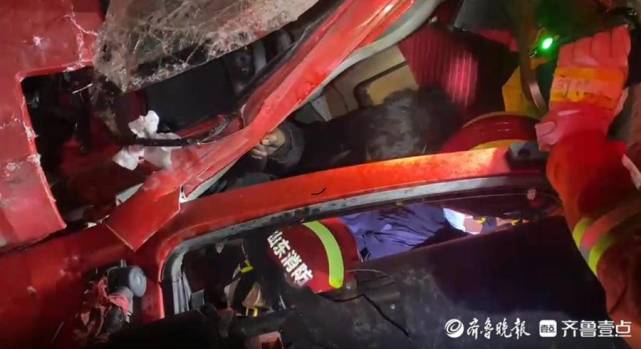 两半挂车发生碰撞致一人被困,聊城消防紧急救援