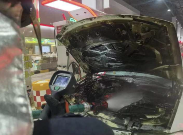 好在,车头开始冒浓烟时,加油站的工作人员就拿起身边的灭火器处置起来。“他们朝着车头部位喷了大概有十几瓶干粉灭火器,我们赶到的时候,明火其实已经被扑灭了。”消防员说。