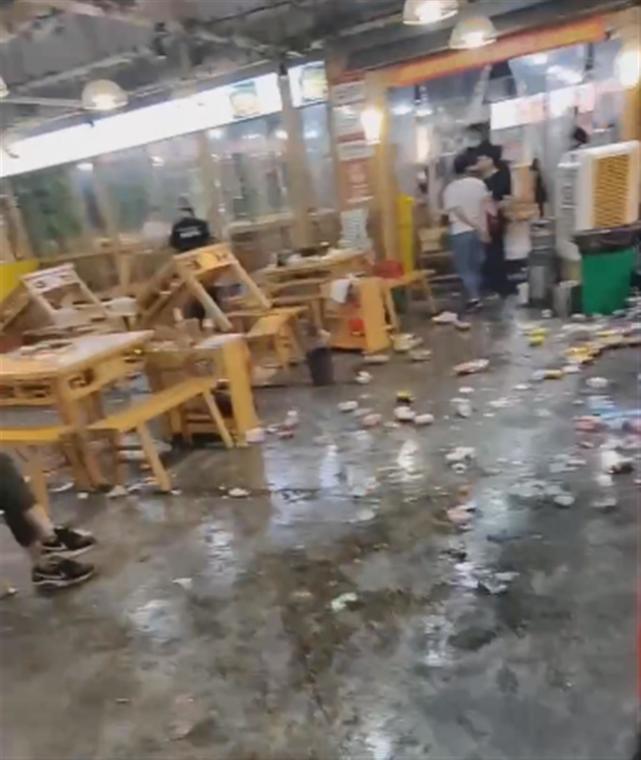 网传视频显示,在一火锅店门口,站着不少客人,店内一片狼藉,遍地是饮料瓶等物品,还有桌子被掀翻。