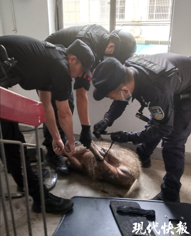 按照既定方案,折腾了好一会,终于顺利擒获野猪,民警用警绳捆住野猪,用居民给的旧窗帘包裹将其抬进警车,“沉甸甸的,我们两个人抬都觉得沉,粗略估计足有100多斤。”彭艳军告诉记者。
