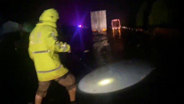 灾害发生后,高速公安已有序组织现场滞留车辆撤离,因车辆长度过长暂时不能调头的车辆已有序停放于应急车道,装载机、挖掘机、转运货车等抢险救援车辆迅速赶往现场。目前,道路正在全力抢通中。