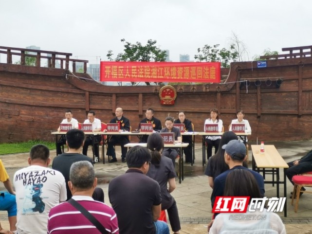 当日,长沙市开福区人民法院湘江环境资源法庭在该院生态修复基地(湘江边上)巡回审判一起涉环境资源民事公益诉讼案件。该案是湘江环境资源法庭首次在湘江边巡回审理的“单人多杆多钩”案件。