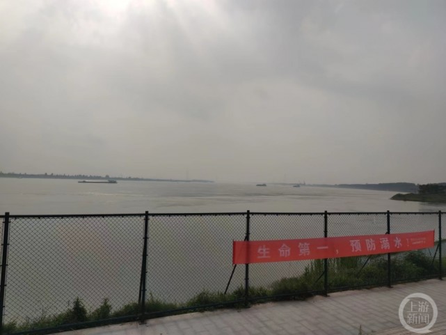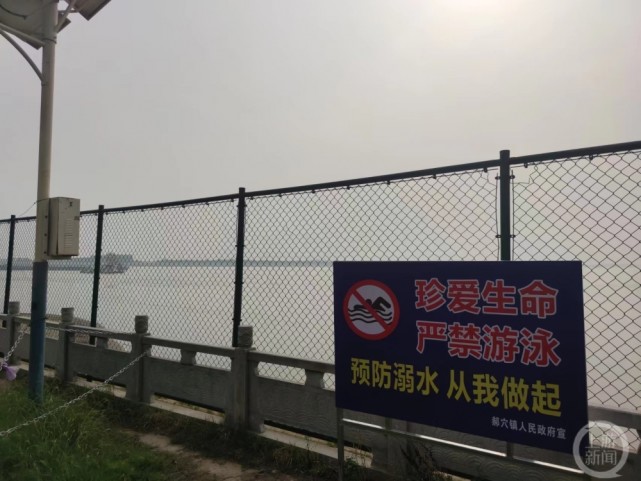 5月30日,上游新闻记者在失踪地附近看见,江堤上装有铁栅栏,上面挂着横幅,横幅上写着:生命第一,预防溺水;另一块展板上写着:珍爱生命,严禁游泳。