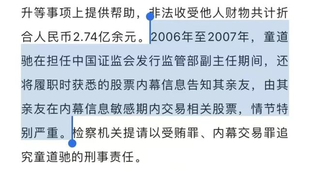 在该案一审时,当时的通稿中提到,童道驰将履职时获悉的股票内幕信息告知其亲友,由其亲友在内幕信息敏感期内交易相关股票,“情节特别严重”。