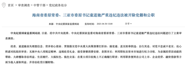 据中央纪委国家监委官网显示,2020年11月2日,海南省委常委、三亚市委书记童道驰任上被查,2021年4月30日被双开。