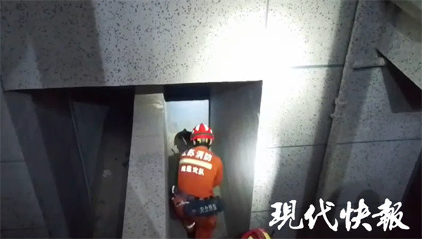 据介绍,6月5日17时54分左右,南通市消防救援支队启东市圆陀角消防救援站接到报警后,立即赶赴现场救援。从现场画面中可以看到,男子身处天井内,情绪稳定,有一只猫伴其左右。消防救援人员简单询问其伤势,并架设好一架六米长的拉梯,安排一名队员下至天井平台辅助被困人员。
