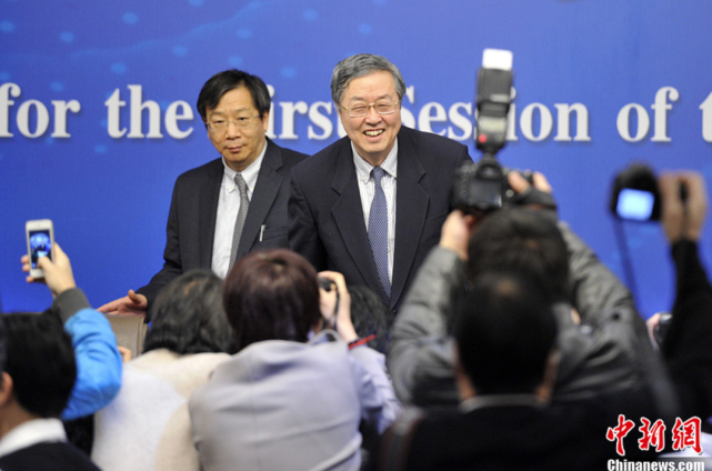 △2013年,时任央行行长周小川,时任央行副行长、国家外汇管理局局长易纲出席十二届全国人大一次会议记者会