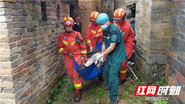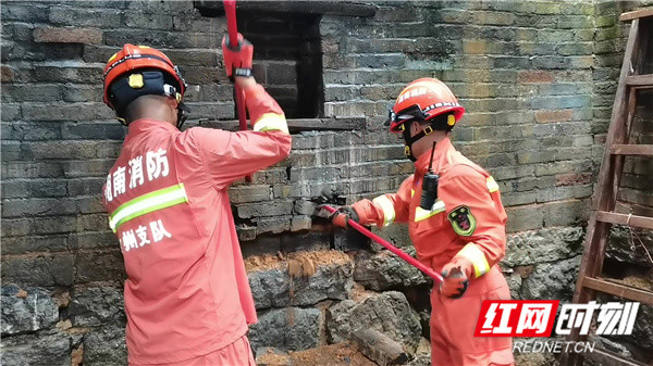 11时36分,道县消防救援大队接到报警称:蚣坝镇小塘复村有一人被困墙缝,呼吸困难,情况危急,请求救援。接到报警后,消防救援人员立即出动1车7人赶赴现场进行处置。