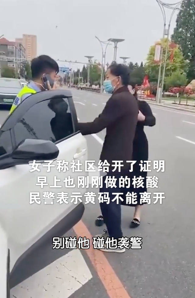 报道中提到,女子称社区给开了证明,早上也刚刚做的核酸。民警表示黄码不能离开。交涉过程中女子倒地,其父亲上前击打民警。