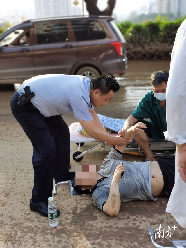 日前傍晚,韶关市公安局浈江分局南门派出所民警带辅警执行任务后驾驶警车返回途中,当车行驶到韶关市浈江区浈江大道北时,在路面看见一名脚穿拖鞋、下穿黑色中裤、上着灰色短袖、满身沾满泥浆的男子倒在地上,一动不动,在沉积淤泥的道路中间还倒着一辆黄色共享电动车,过往车辆驾驶人见状纷纷减速绕行,车辆随时会对该市民造成二次伤害,危及生命。民警见状,立即将警车打横停放在来车方向距离男子5米左右的位置,打开警灯,警示过往车辆,为受伤男子筑起一道生命安全保护墙。