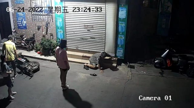 根据监控视频显示,6月24日十一点二十四分,2对男女走在在一条小巷里,其中一名身穿黑白条纹短袖的男子走路踉踉跄跄,推倒了停放在路边的电动车,男子身旁的粉衣女子见状立马冲上前狠狠踹了他一脚,男子随即摔倒在地,鞋子也飞了出去,同行的黄衣男子将被醉酒男子打倒的电动车扶起。