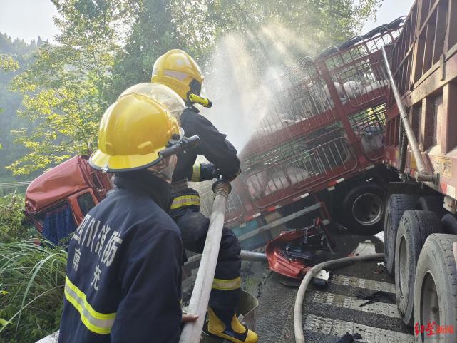 当天早上,南充市消防救援支队接到司机报警后,立即调派救援人员前往处置。救援人员到达现场后,了解到事故为连续车祸,现场有多辆车被撞,其中一辆运载70头左右生猪的货车直接冲出道路。救援人员介绍,运猪车的驾驶员未受伤,另一辆车有受伤人员,已被救护车接走。