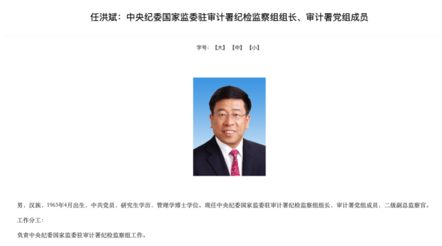 6月6日,审计署网站更新后显示,此前担任国务院国资委副主任的任洪斌已任中央纪委国家监委驻审计署纪检监察组组长、审计署党组成员。