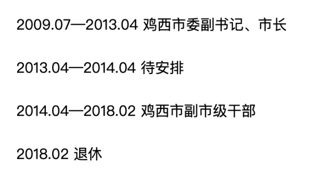 在官方公布的简历中,2013年4月辞去鸡西市市长职务后,朱德义经历了一年的“待安排”时间,2014年4月,他成为鸡西市副市级干部,2018年2月,55岁的他退休。