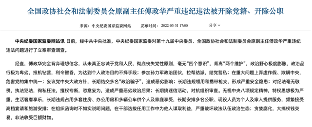 2022年3月,傅政华被双开,当时官方的通报中,还出现了不少罕见措辞。