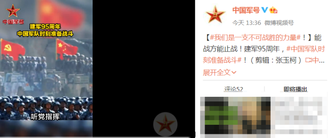 7月30日,“中国军号”播发短视频,标题为《建军95周年中国军队时刻准备战斗》。该视频微博配文称:“能战方能止战”,视频话题设置为“中国军队时刻准备战斗”。