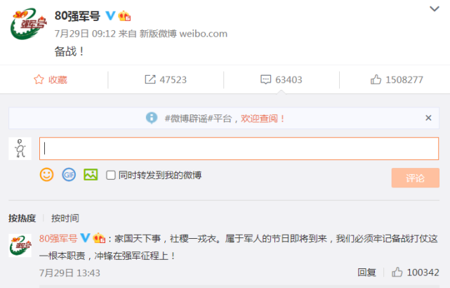 7月29日,80集团军微博“80强军号”刊发了一条简短精悍的微博:“备战!”截至政知见发稿时,这条微博的评论已经超过6万,点赞超过140万。