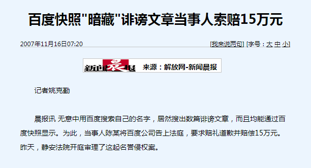 记者随手在百度上查询,轻易就能找到不计其数的用户苦恼于网页快照曝光了自己的私隐,而这一问题在十多年前就被人们讨论过。在2008年,有网友发现自己多年前在网站上留的个人联系方式居然还能被查到,这名网友认为自己会时不时收到垃圾短信就是因为网页快照泄露了个人隐私。在2007年,媒体曾经报道过百度快照暗藏诽谤文章,文章当事人索赔15万元。直到近些年,仍有人在讨论网页快照是否会侵犯个人隐私、是否存在侵权的问题。
