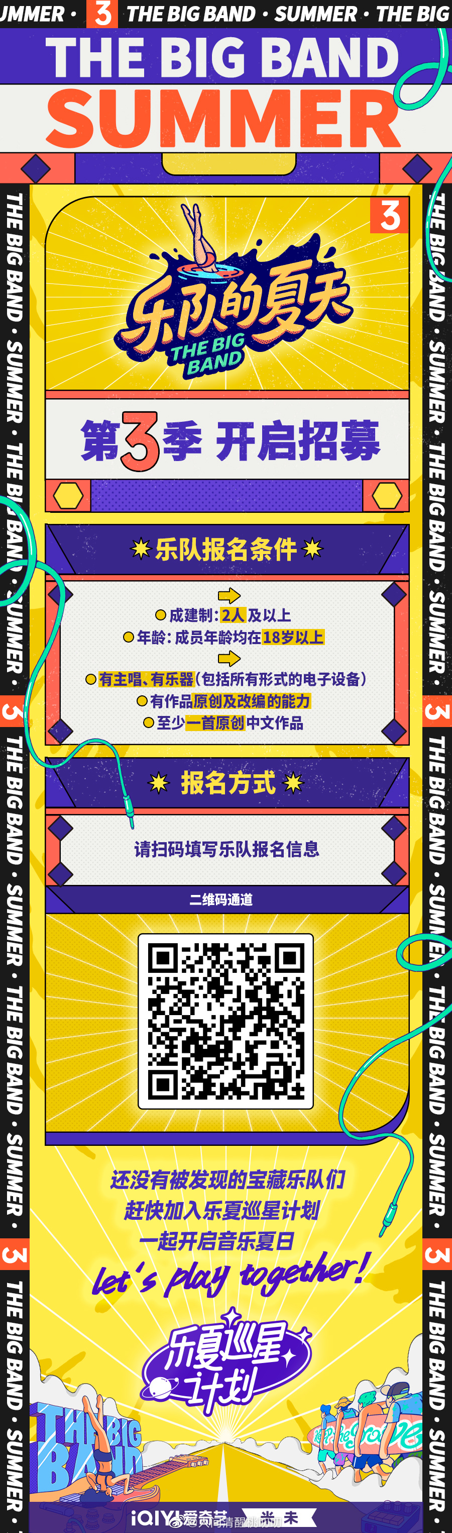 《乐队的夏天》第三季,终于官宣了。今日,乐队招募正式启动。节目组向有主唱有乐器,有作品原创及改编的能力,至少一首原创中文作品的乐队们发出邀请,欲发掘更多还没有被发现的宝藏乐队,一起开启音乐夏日。
