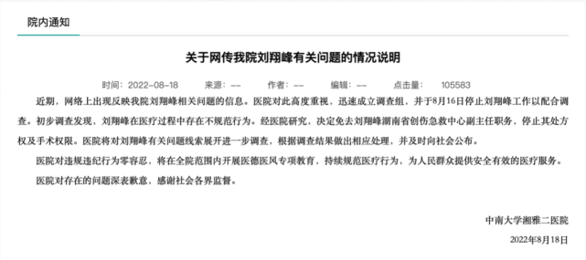8月18日,中南大学湘雅二医院发布了情况说明。
