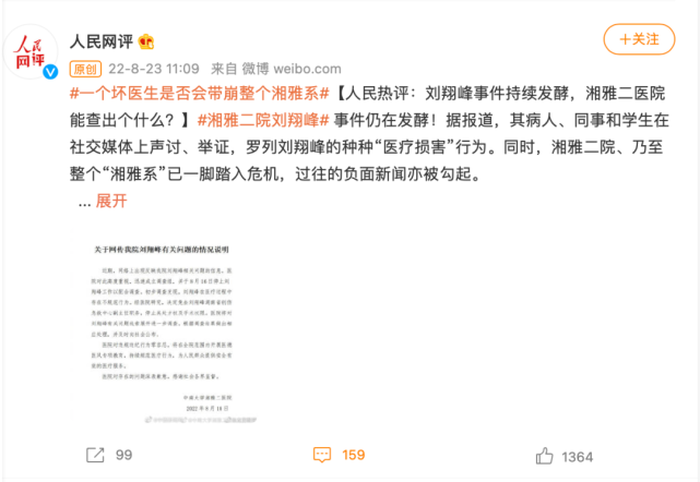 8月23日,@人民网评发布了《刘翔峰事件持续发酵,湘雅二医院能查出个什么?》一文。