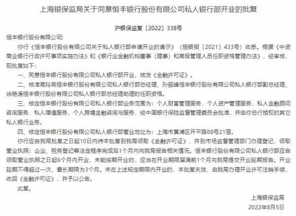 近日,恒丰银行私人银行专营机构获得中国银保监会上海监管局同意开业的批复。