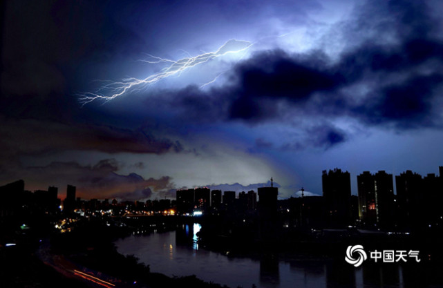 6月5日凌晨,广西百色市右江区出现雷雨,闪电划破长空